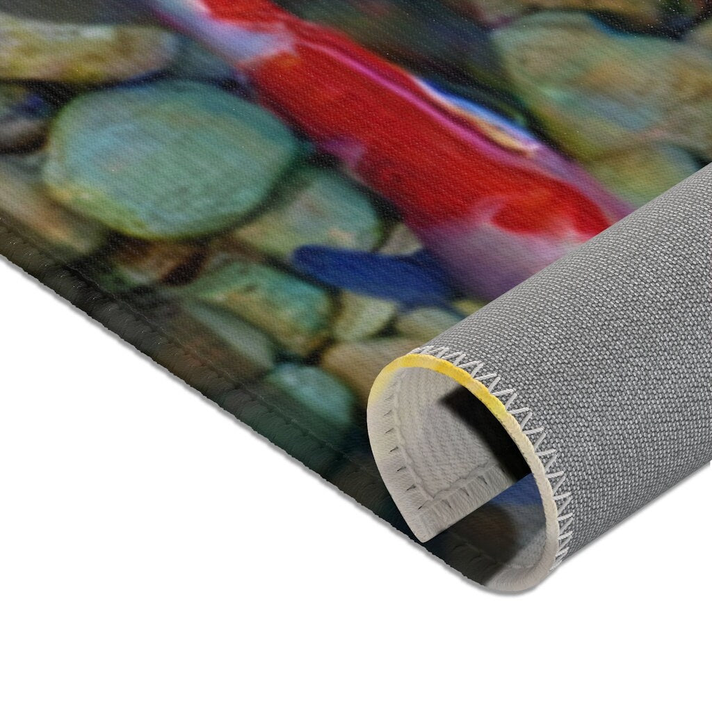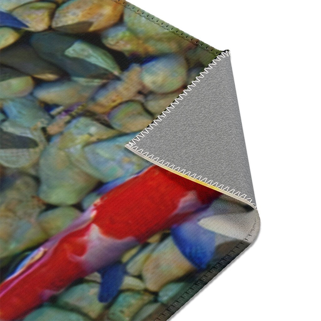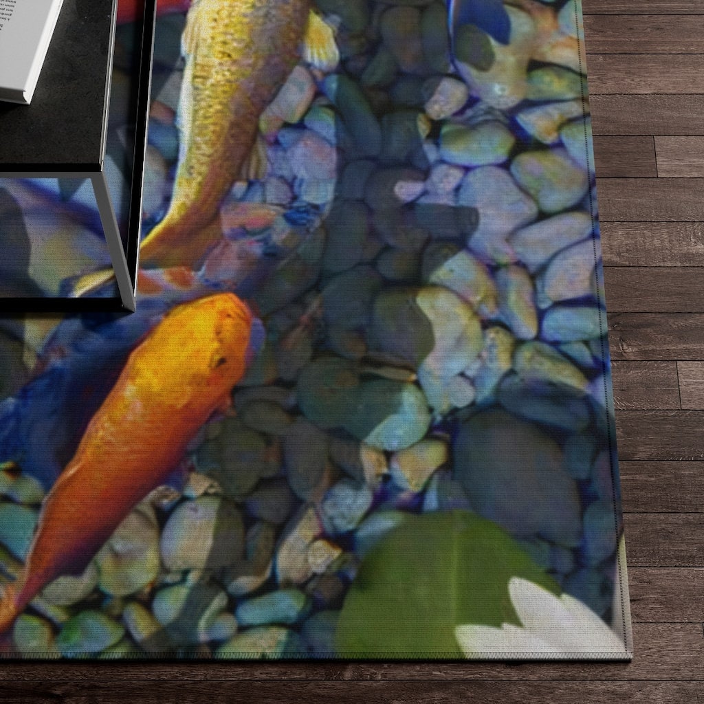 Bring the lucky 9 kois into your home and effortlessly match your aesthetics. Realistic 3D print of the 9 koi fish pebble pond on this area rug features hemmed edges and a coated backing, ready for any style of home decor.