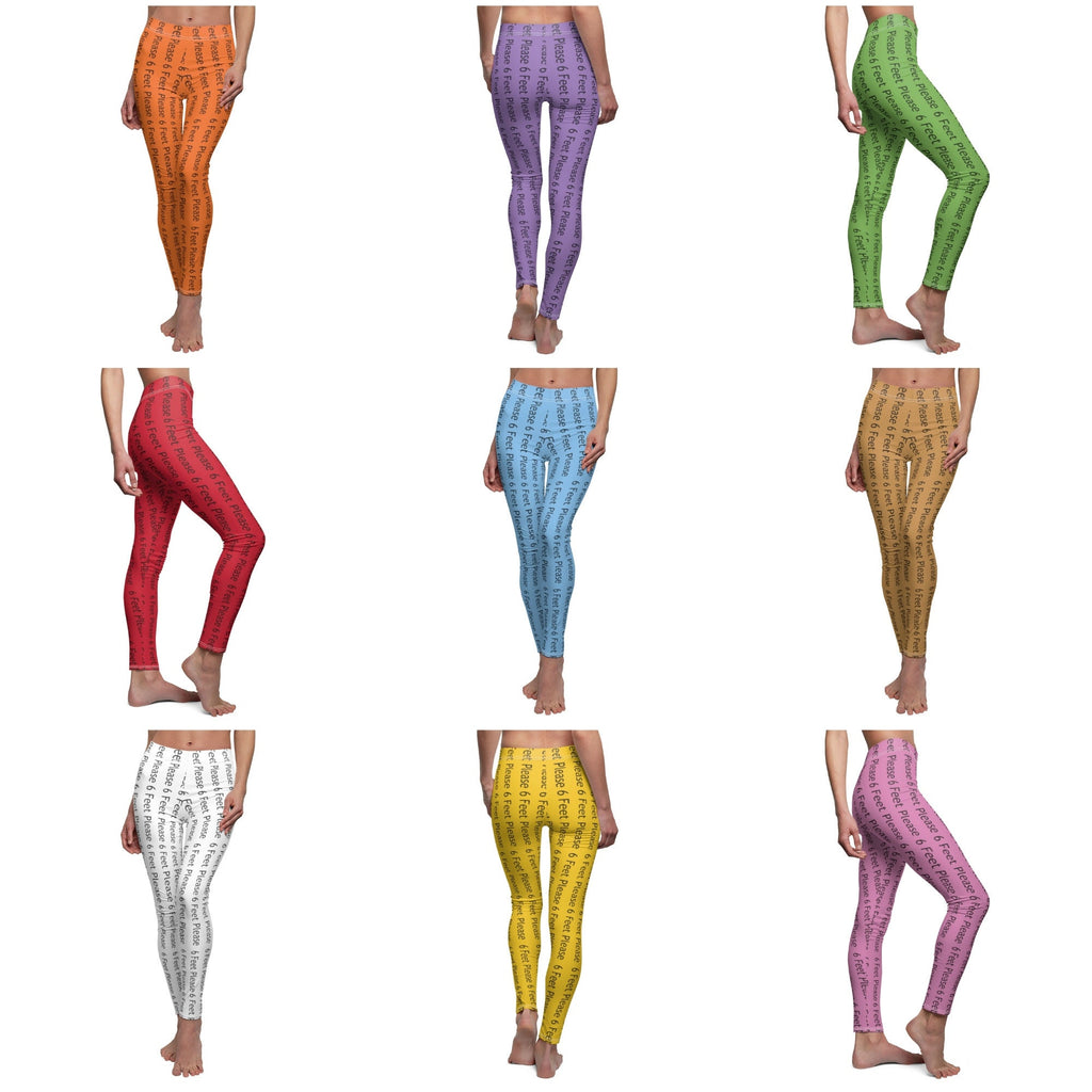 Made in USA. Make a Covid season fashion statement with these Super soft and comfortable casual skinny leggings with Catchy Covid phrase 6 feet please Covid Seasonal Leggings in multiple sizes and colors.