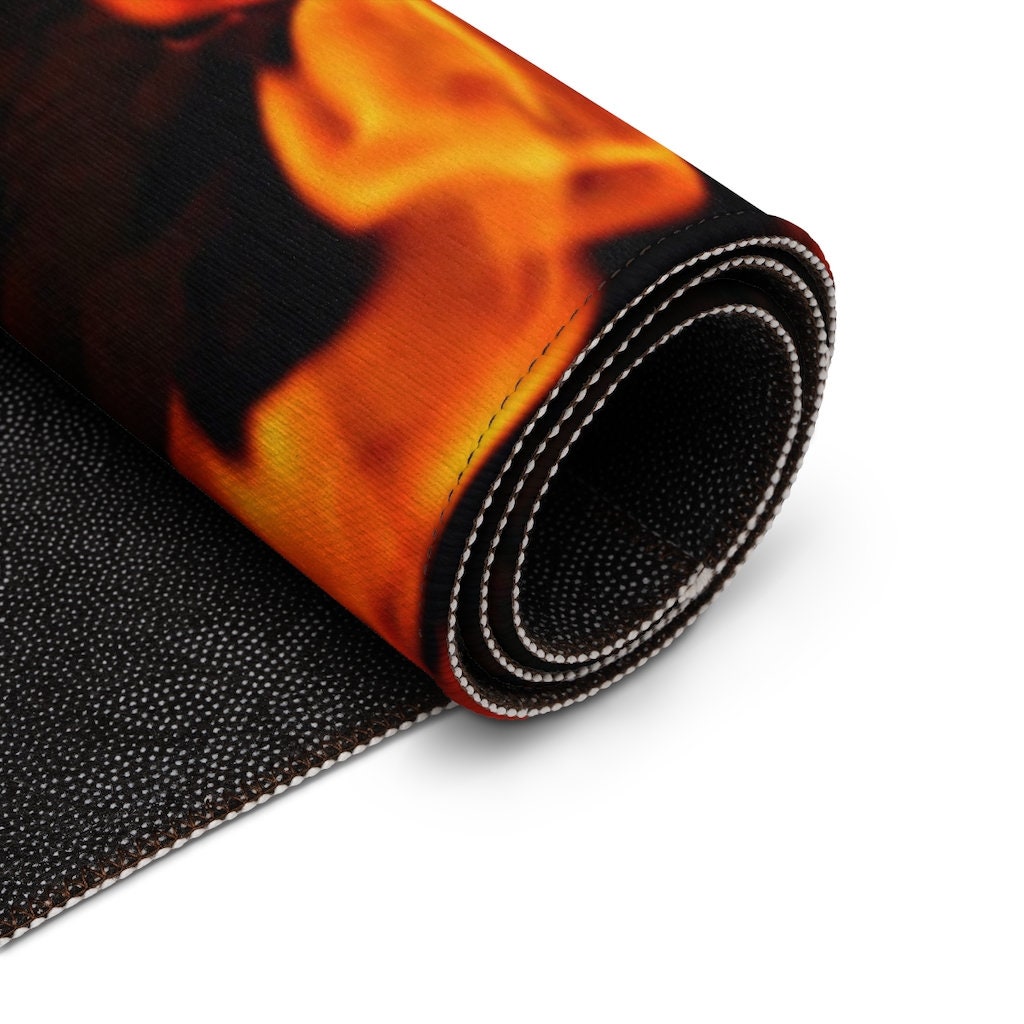 For the fire lover or flames fan, this realistic fire flames printed on this area rug features hemmed edges and a coated backing, ready for any style of home decor.