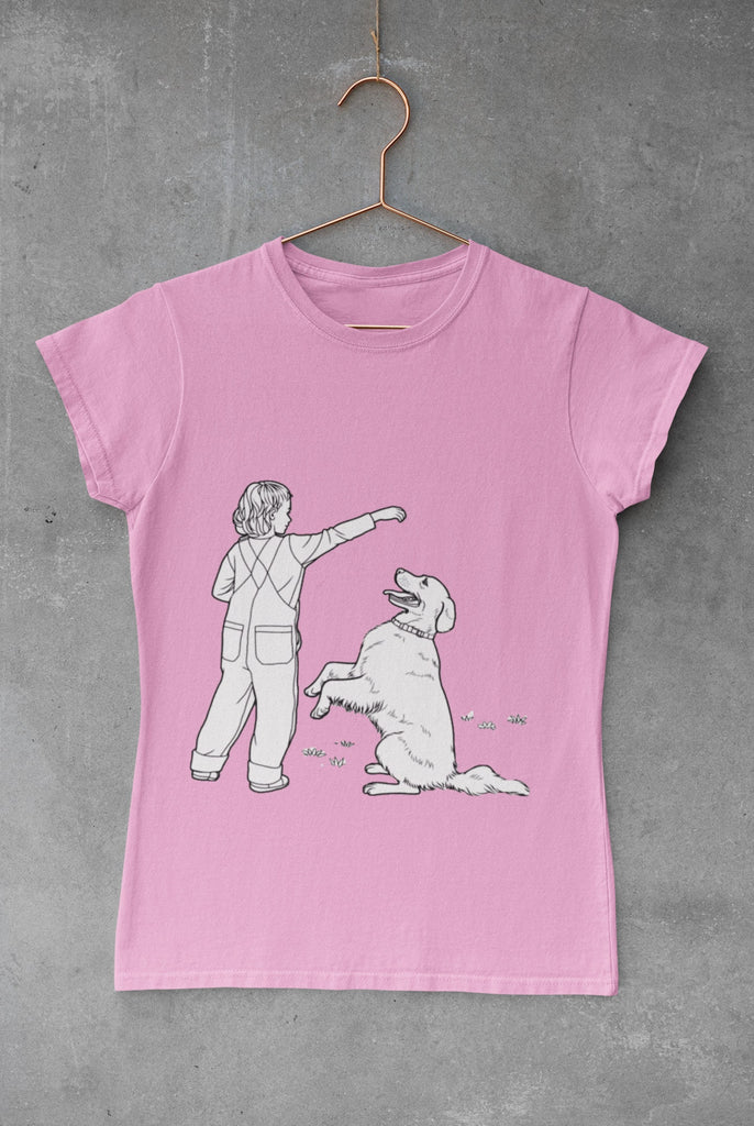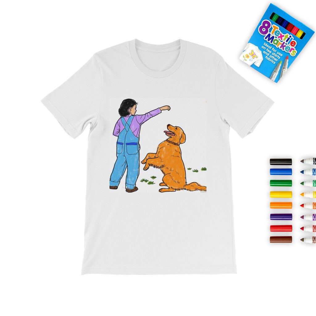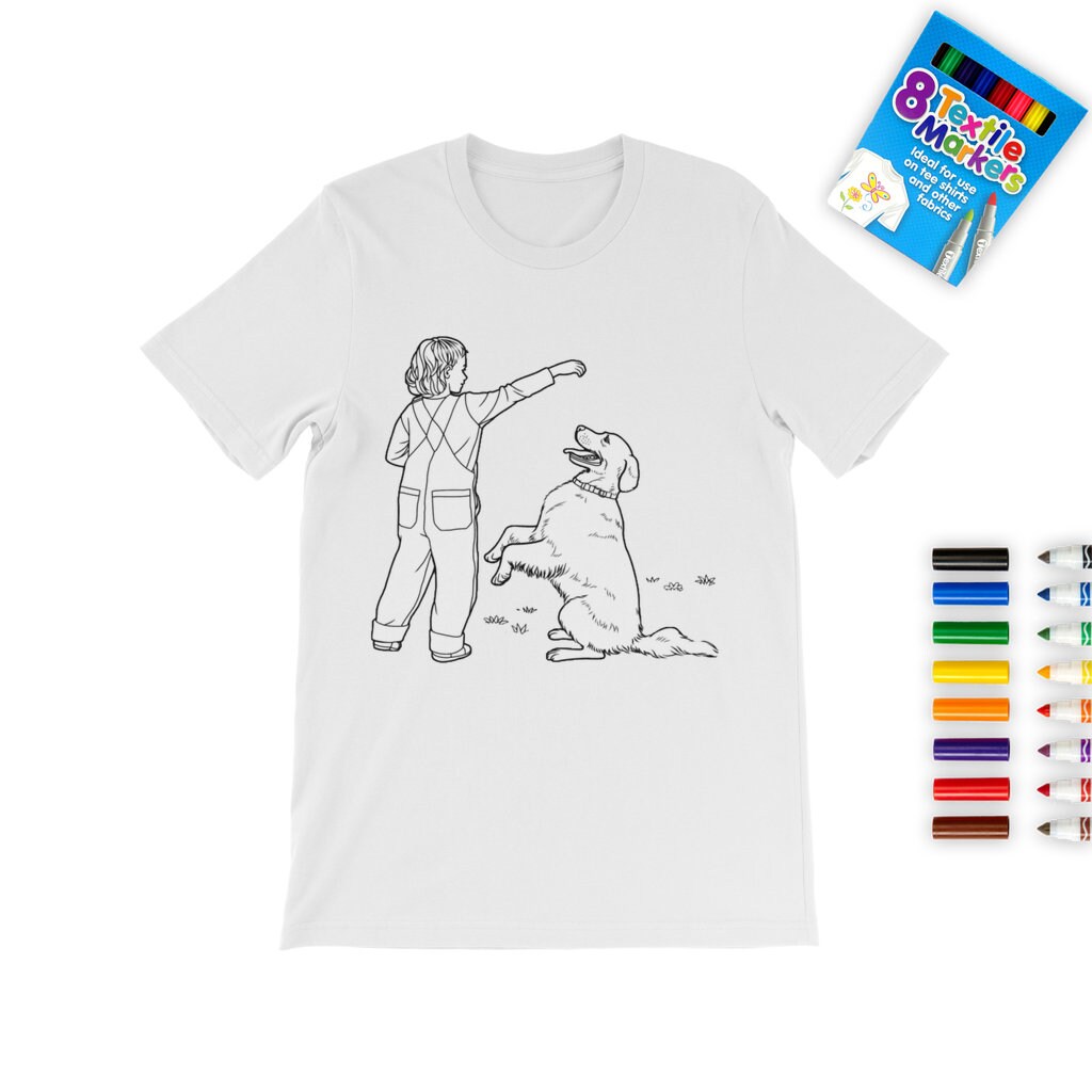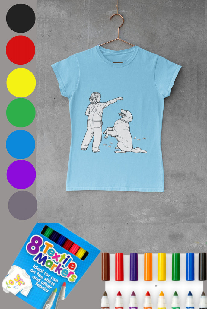 Girl with Labrador Retriever - Add your own color/pic/text to this crew neck short sleeve Colouring T-Shirts. Unique and creative products that bring collaborative fun to both adults and kids. The t-shirts are 100% ringspun cotton and come with 8 different non-toxic textile markers.