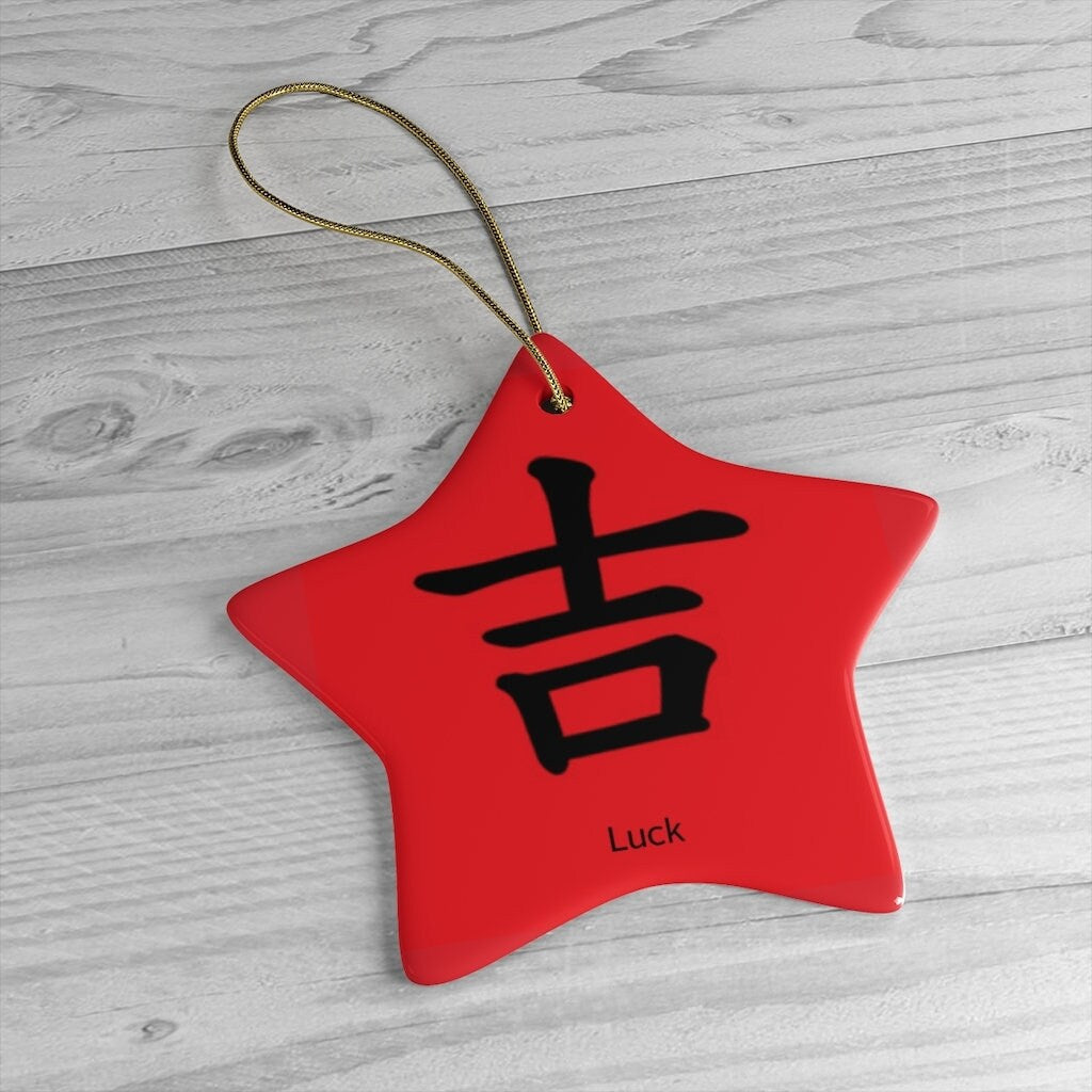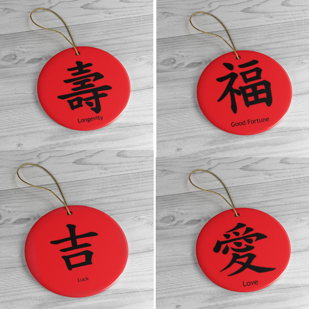 Available in different shapes and in Christmas/Lucky red as individual ornaments with one Chinese character on one side. Take your pick and choose your shape and symbol preference when you order. See other listing for a combo of symbols in one ornament.