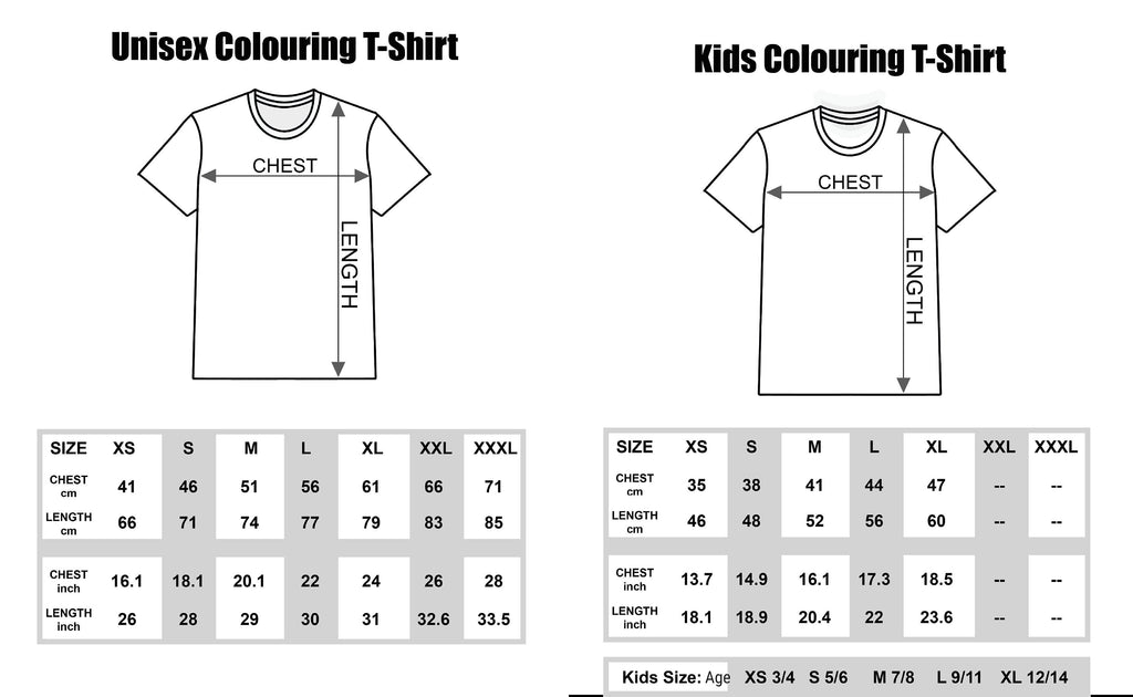 - Adult T-Shirt Sizes; S 8/10 M 10/12 L 12/14 XL 14/16 2XL 18/20
