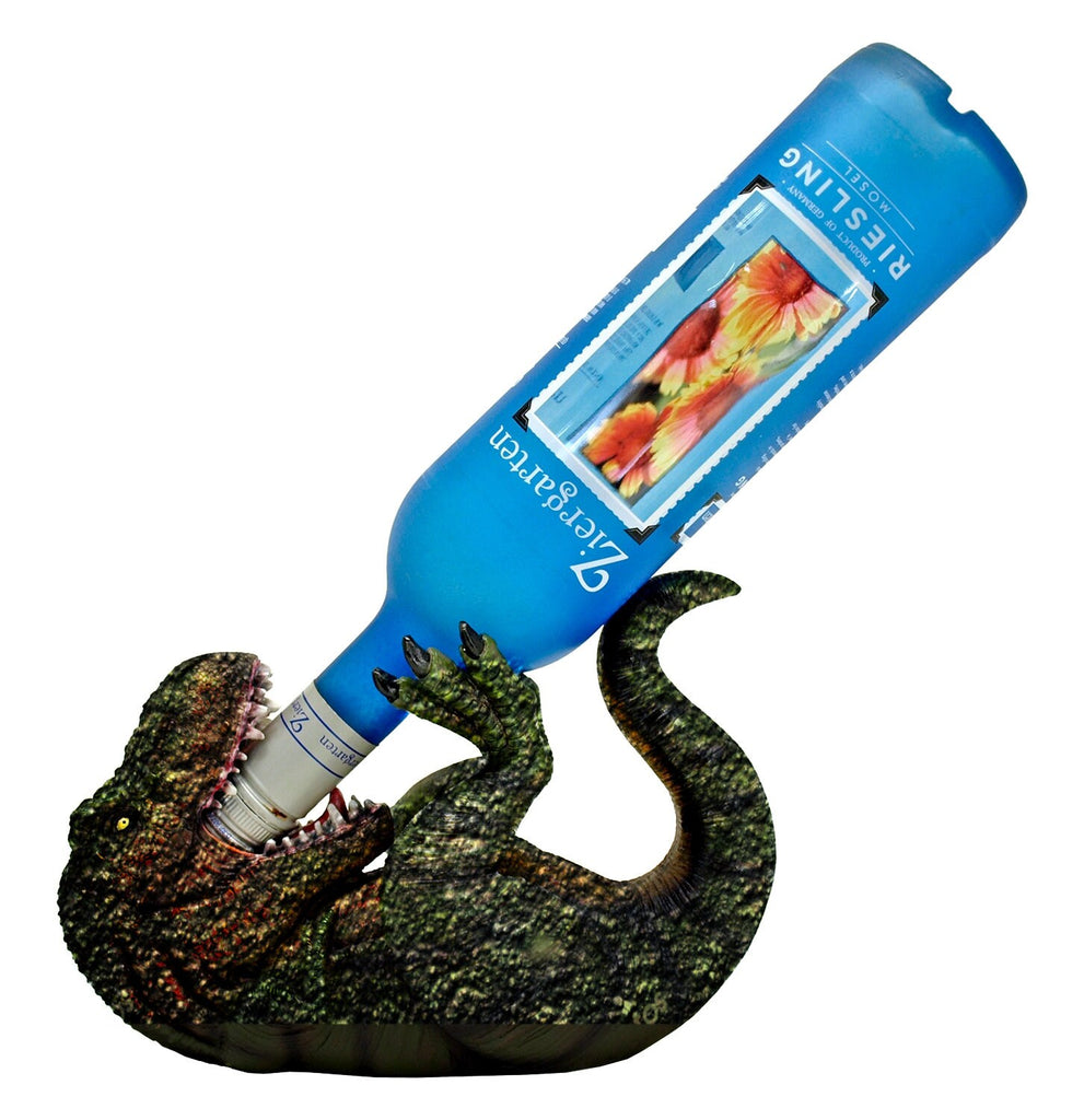 This laid-back tyrannosaur may not be as alarming as its prehistoric cousin, but it is no less exciting as he kicks back to wet his whistle. This cool cast resin t-rex wine bottle holder is a fun piece of home decor that makes a great centerpiece for a wine cellar, bar, your dining table or the kitchen counter. It's hand painted in a green and brown finish textured to resemble the Jurassic beasts natural appearance. The T-Rex bottle holder accepts a single standard sized wine bottle, not included, and if you're not a wine drinker, he'll happily hold your bottle of spirits or infused cooking oil.
