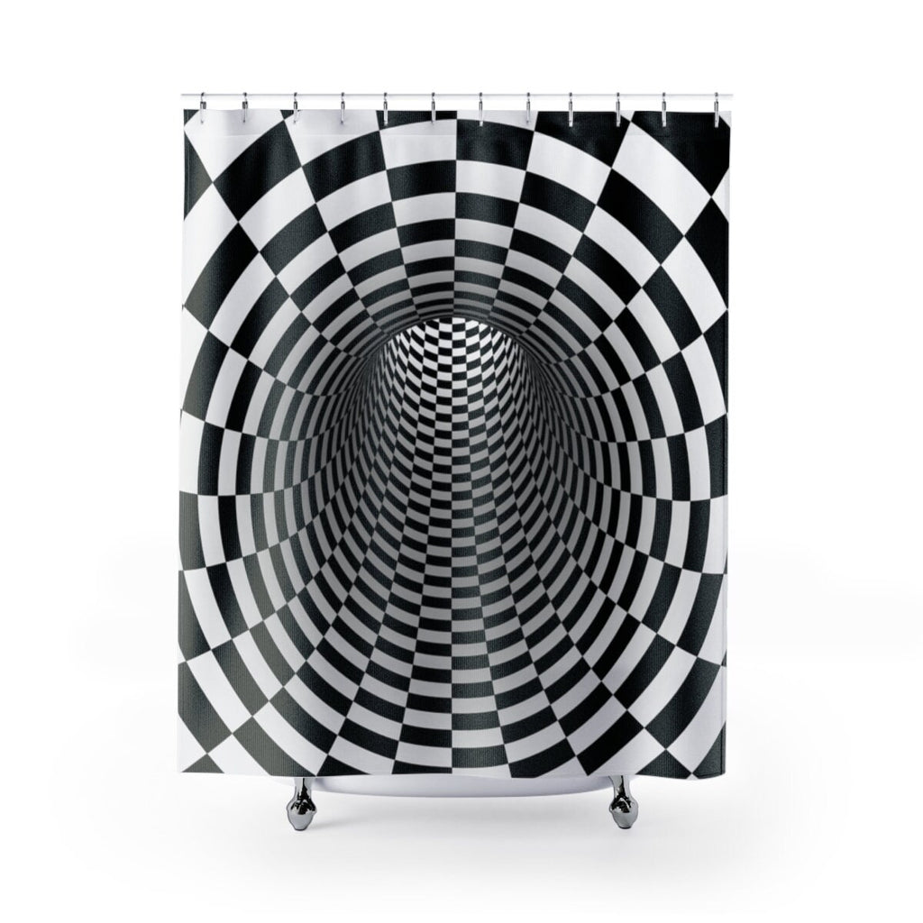 Fulfill your secret hypnotic optical art illusion fantasies in the bathroom with this Checkered Vortex printed shower curtain. Suits any bathroom decor for a minimalist decor and ocean look.
