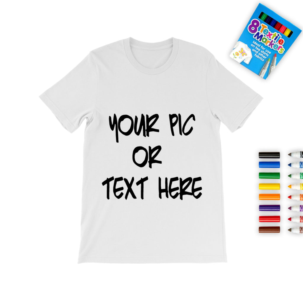 Add your own color/pic/text to this crew neck short sleeve Colouring T-Shirts. Unique and creative products that bring collaborative fun to both adults and kids. The t-shirts are 100% ringspun cotton and come with 8 different non-toxic textile markers.