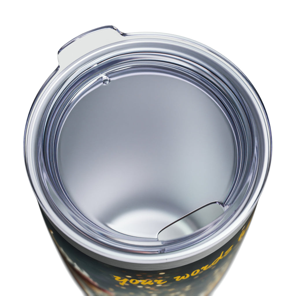 Minimize your plastic footprint with style. This tumbler is the best companion on road trips – it fits perfectly into car cup holders. These custom 20oz tumblers feature a double-wall, stainless steel construction for high-end insulation and durability. The clear, push-on plastic lid makes sipping a breeze on the go while the ribbed bottom provides an optimized, steady grip. Choose between 3 gorgeous colors to best compliment your words. All tumblers come with a glossy varnished print.