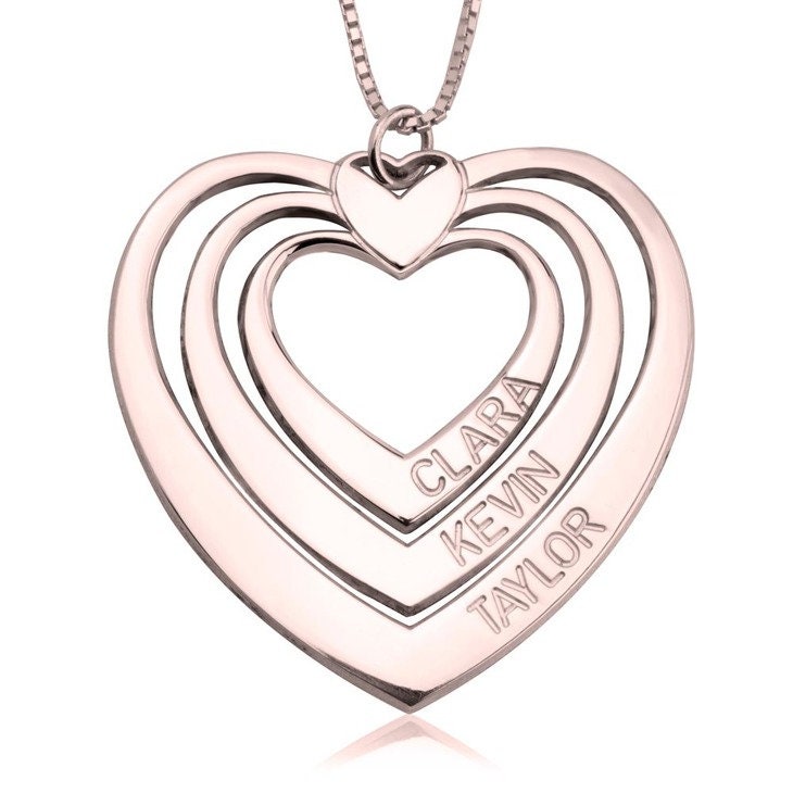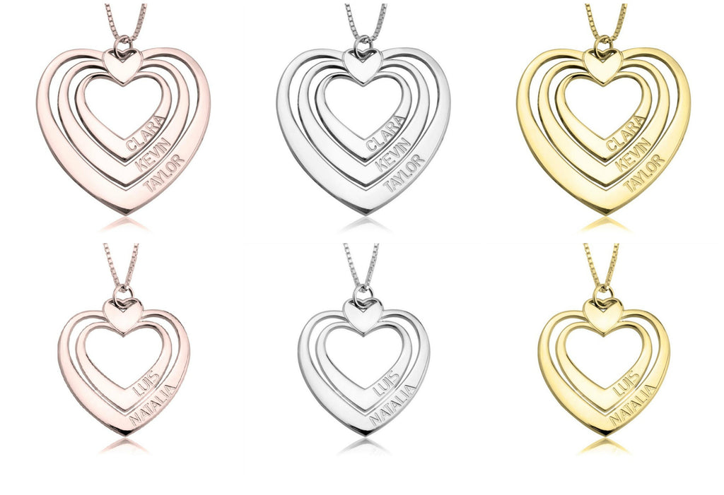 Get this amazing necklace that has 3 or 2 inset hearts of different sizes fixed together. And personalized each of them with a name or word of your choice.