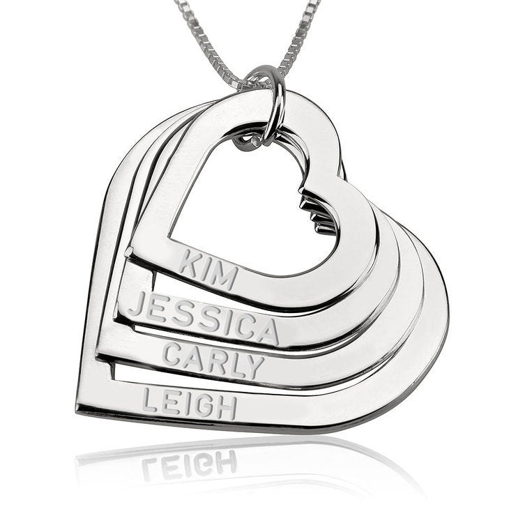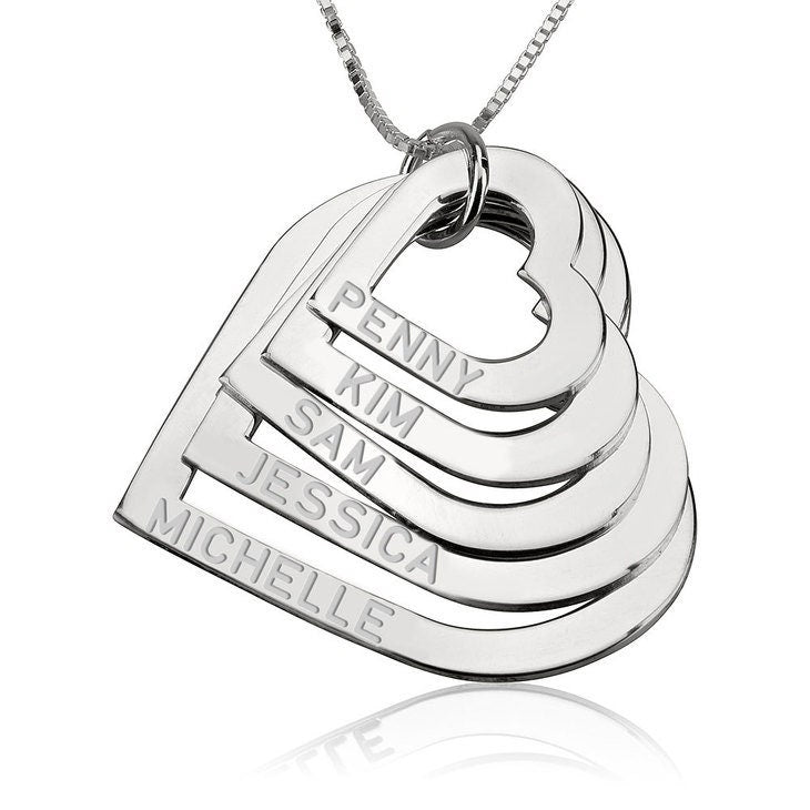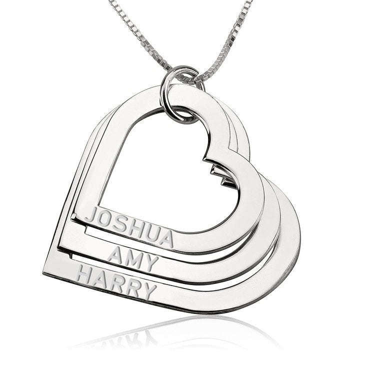 Get this amazing necklace that has inset hearts of different sizes fixed together. And personalized each of them with a name or word of your choice.