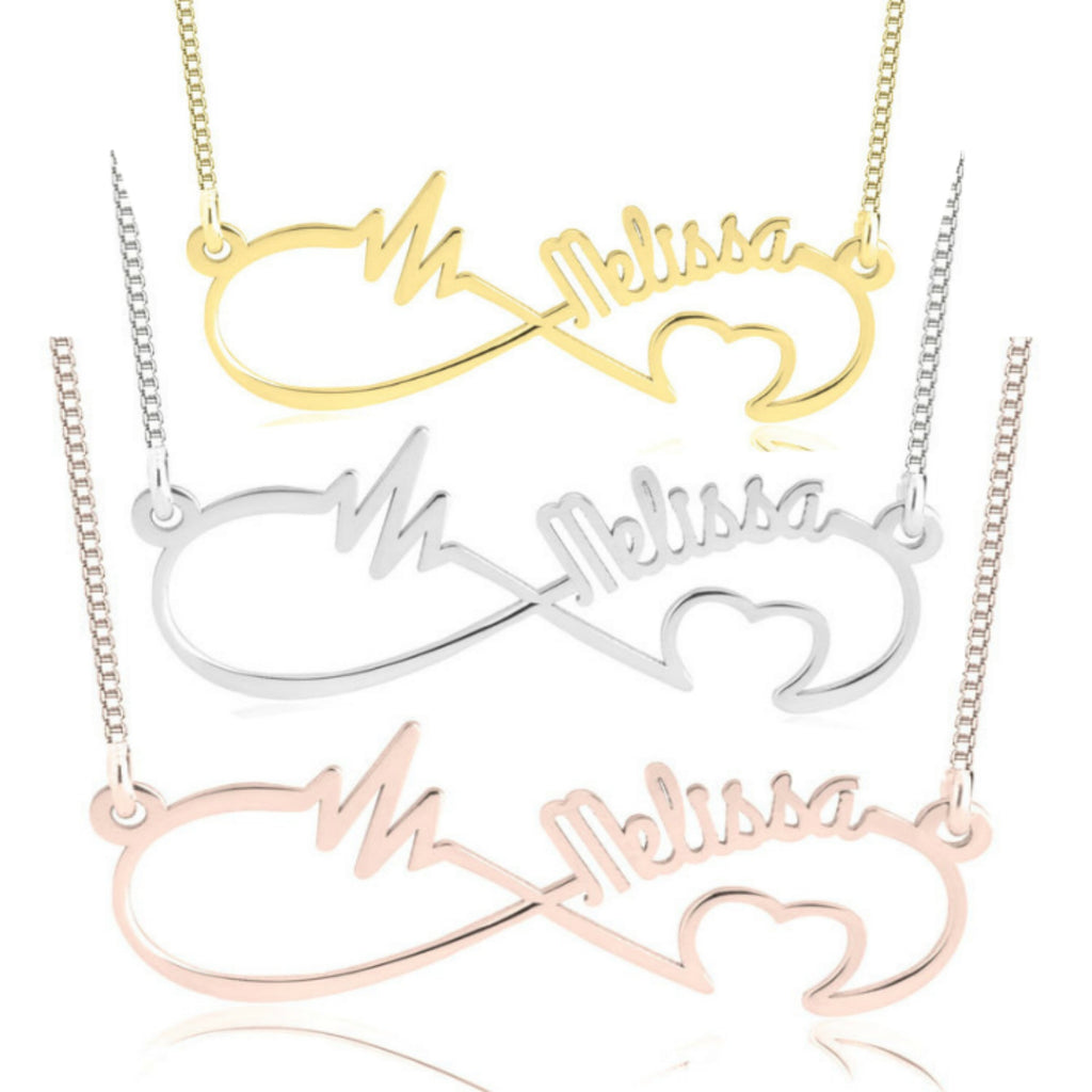 Our Personalized Infinity Heartbeat Necklace is an original jewel that will surely be loved by anyone. An infinity pendant with many elements. On the upper left our already known heart beat, on the upper right a name or word of your choice, and on the lower right a heart.