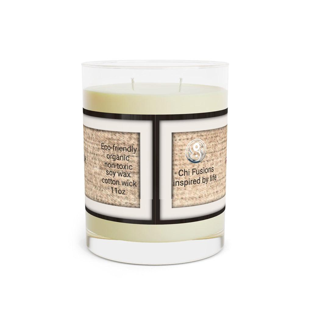 This custom candle is made 100% with a natural soy wax blend and cotton wick. Choose between ambrosial fragrances such as Vanilla Bean, Comfort Spice, and Sea Breeze.