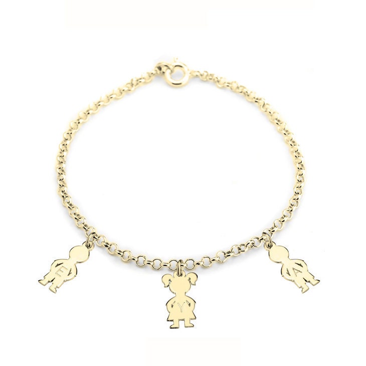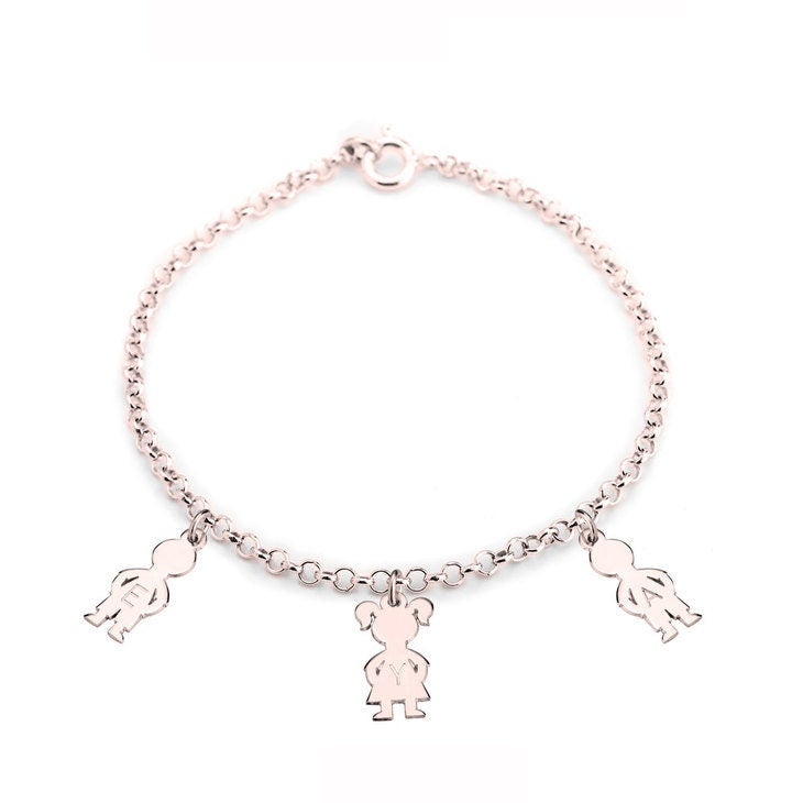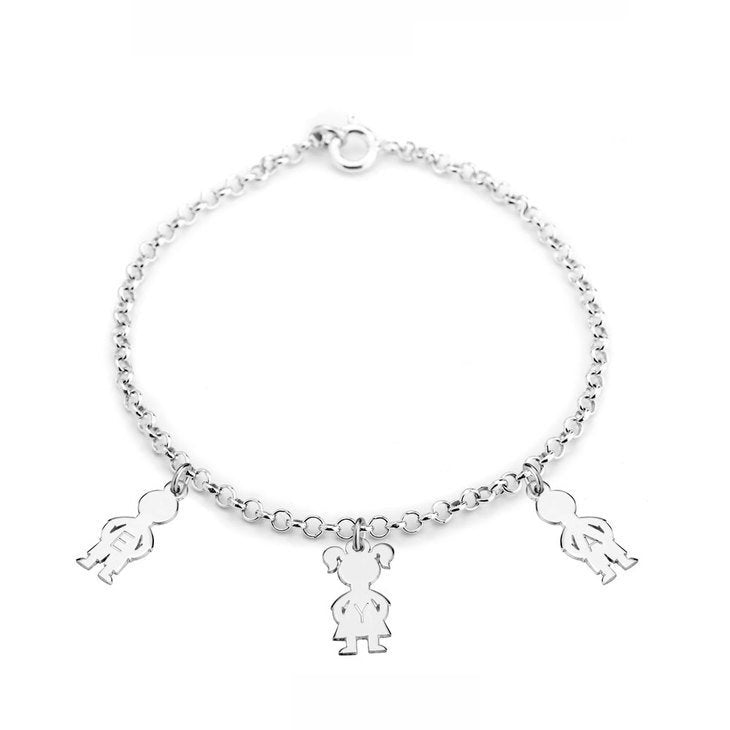 Create your own gorgeous mom charm bracelet, the perfect way to add a touch of glamor and symbolize the beautiful connection between a mother and child. This mom bracelet will be your new favorite piece you won't want to take off, available to customize with boy or girl charms with a cut out personalized initial design.