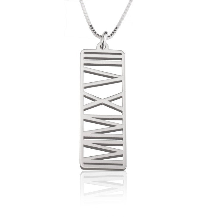 Personalized Roman Numerals Cutout Pendant Necklace-Vertical,Horiz/925 Silver/24K/Rose Gold Plating,Birthday/Mom/Dad/Anniversary/Graduation