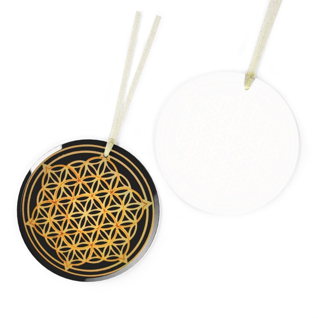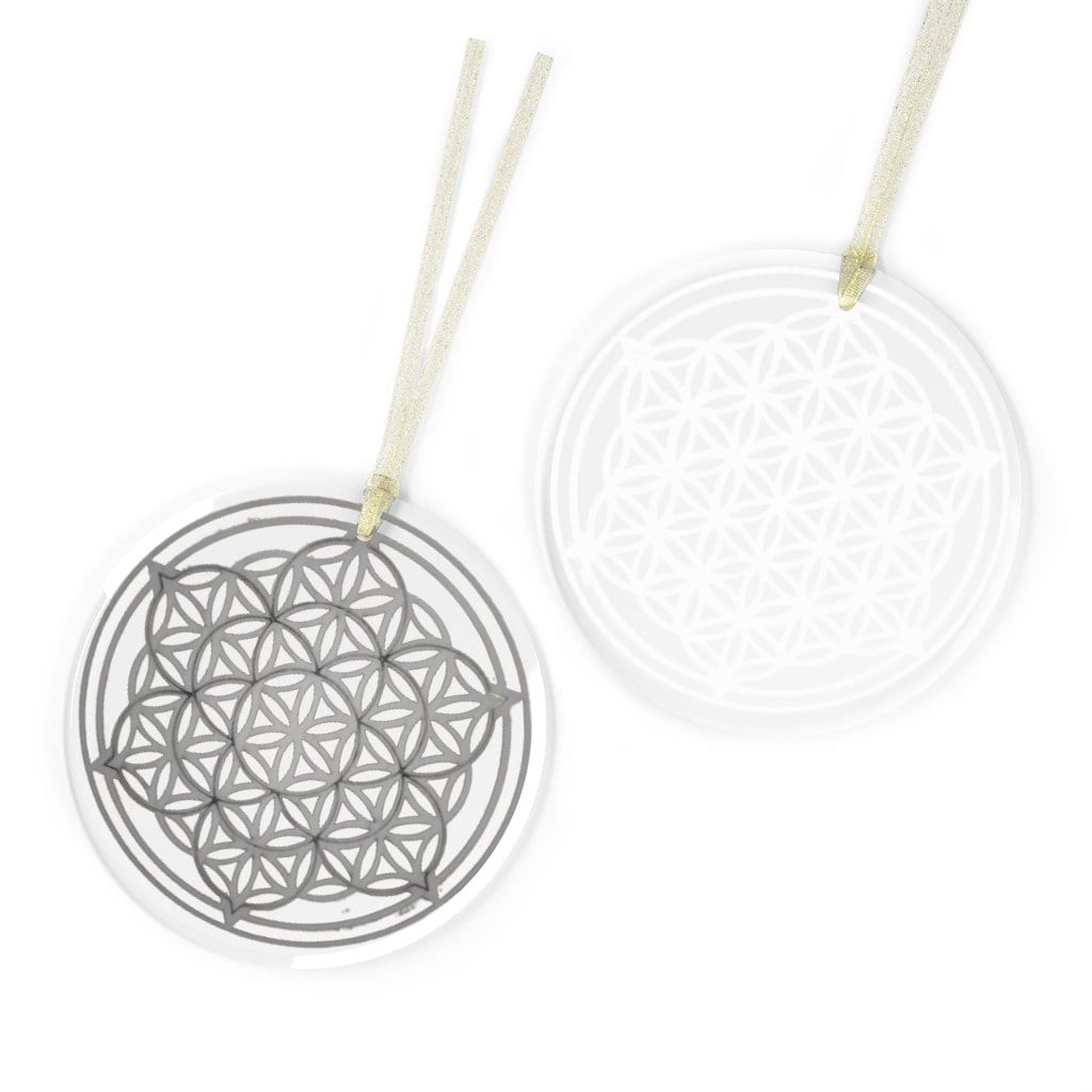 The Flower of Life from Sacred Geometry is printed in silver or gold on glass/ceramic/pewter ornaments make great gifts for any occasion and Yoga/Meditation Room decor.