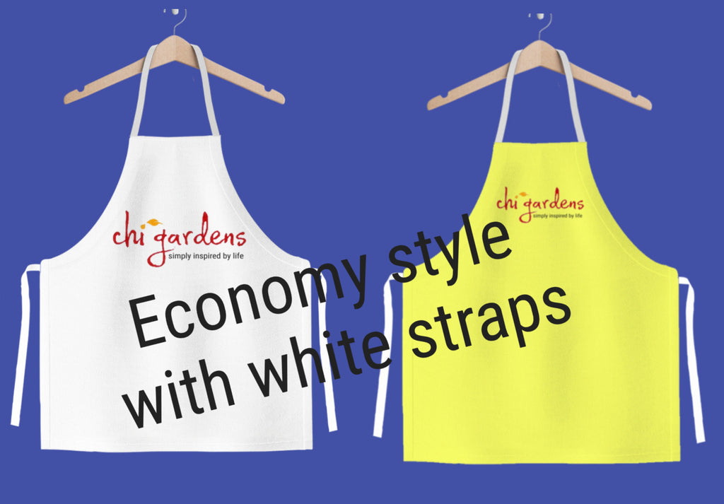 Classic polyester aprons are lightweight sublimation prints, go over the heads and have only white straps that are not detachable.