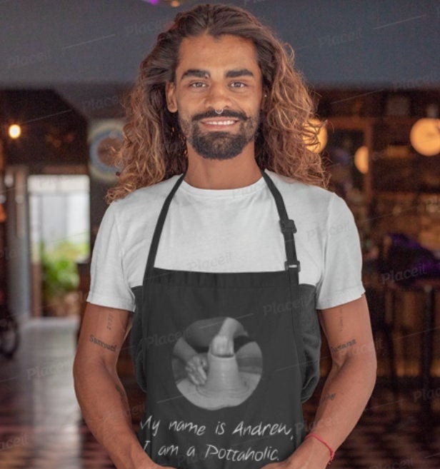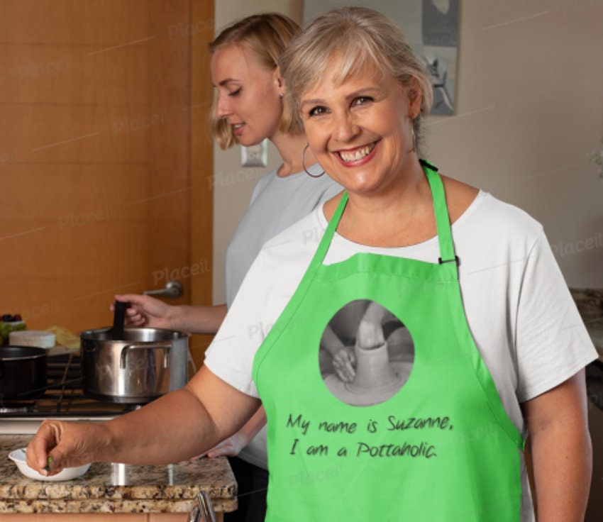 Customizable Aprons without pockets - Look cool without getting dirty. Perfect gifts for that potter /ceramicist/ studio artist/Chef/ Crafter/ Hobbyist friends you know. Our Poly Twill or Classic Apron is a perfect pottery clay art studio accessory. Printed Pottery Clay Art Studio Apron for Potters/Artists/Chefs/Crafter/Hobbyists, Unisex/Unisize, various colors.