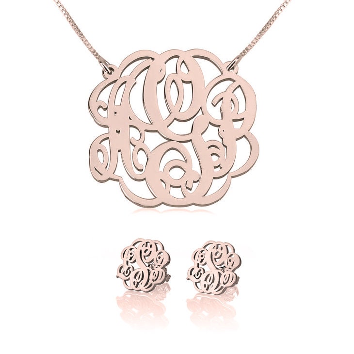 Make the ultimate monogram statement with our Monogram Jewelry Set, available to personalize to suit your truly unique style. Choose between the finest quality Sterling Silver, 24K Gold Plating, and Rose Gold, and we will create a custom design of your unique initials, intertwined in a twisted monogram style font for an effortless old-world glamor look, with matching classy studs and necklace.