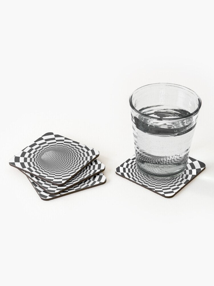 Vortex illusion Square Coasters 4 pc Set,housewarming gift,Birthday/Home decor gift, optical illusion print, op art coasters, geometric vortex printed Leather or Ceramic/Cork Coasters 4pc set, Decorate your home with style with this op art coasters square or round.