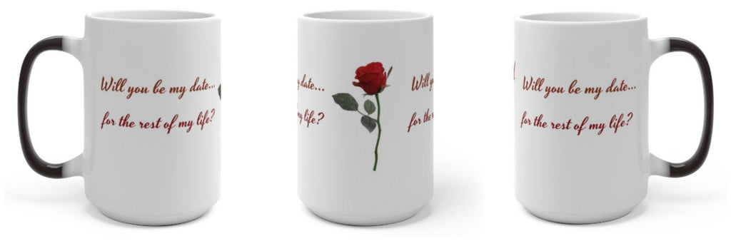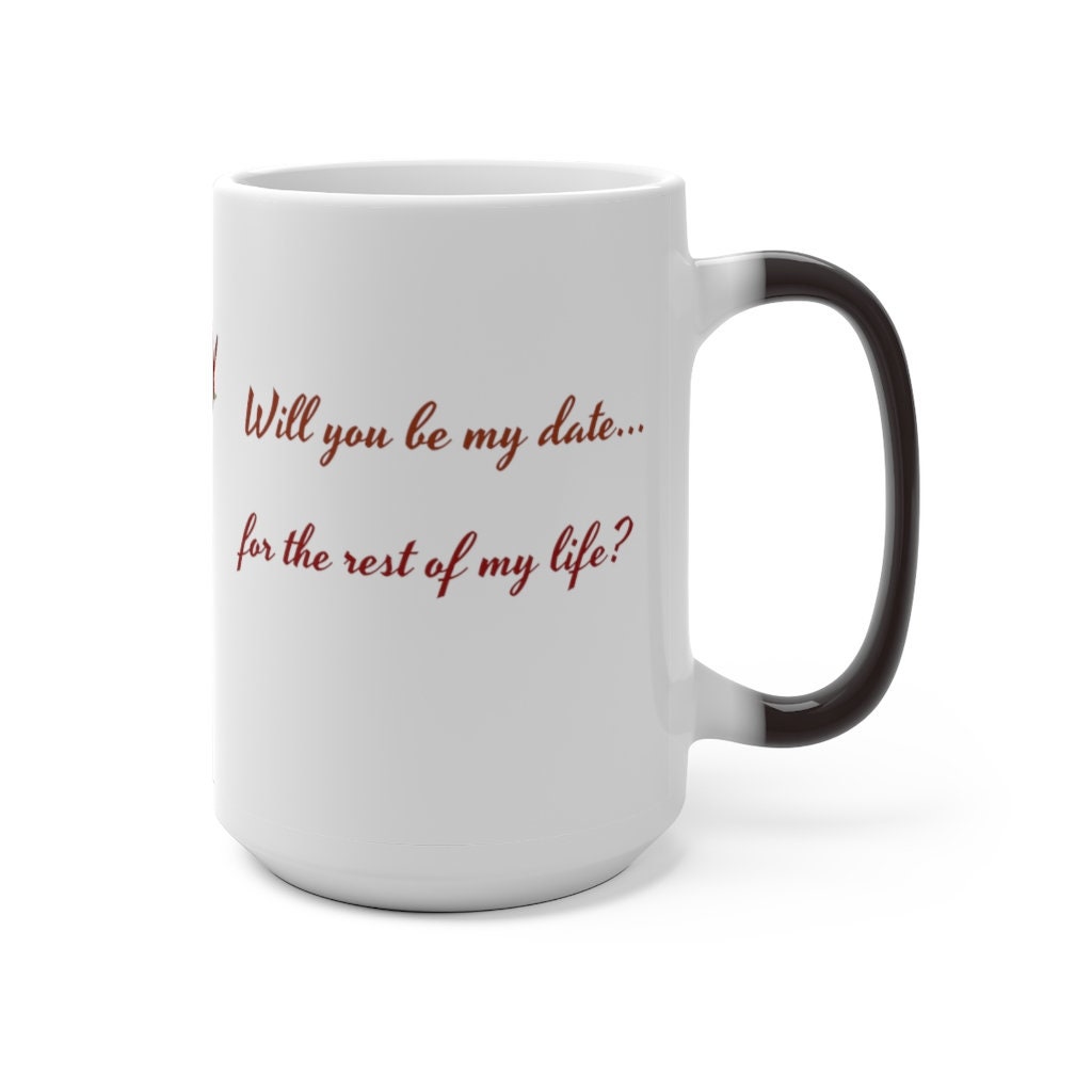 Will you be my date, Heat activated Print-Magic Mug,Color Changing Ceramic Mug, rounded corners. large handle, microwave safe
