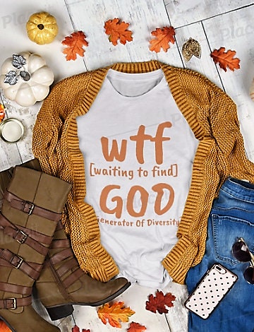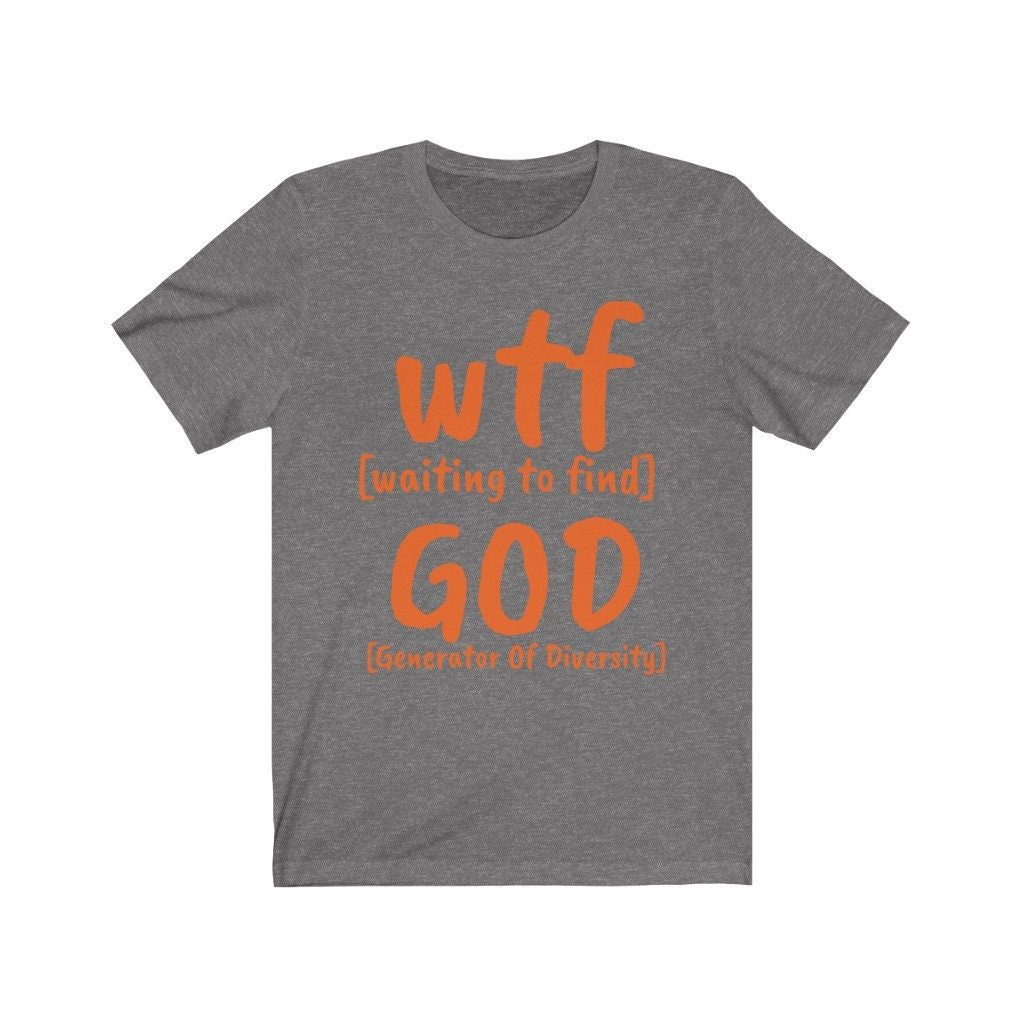 Need a unique gift idea? WTF God, Waiting to find generator of diversity, Unisex funny t-shirts for MEN and Women make great gifts for any occasion.