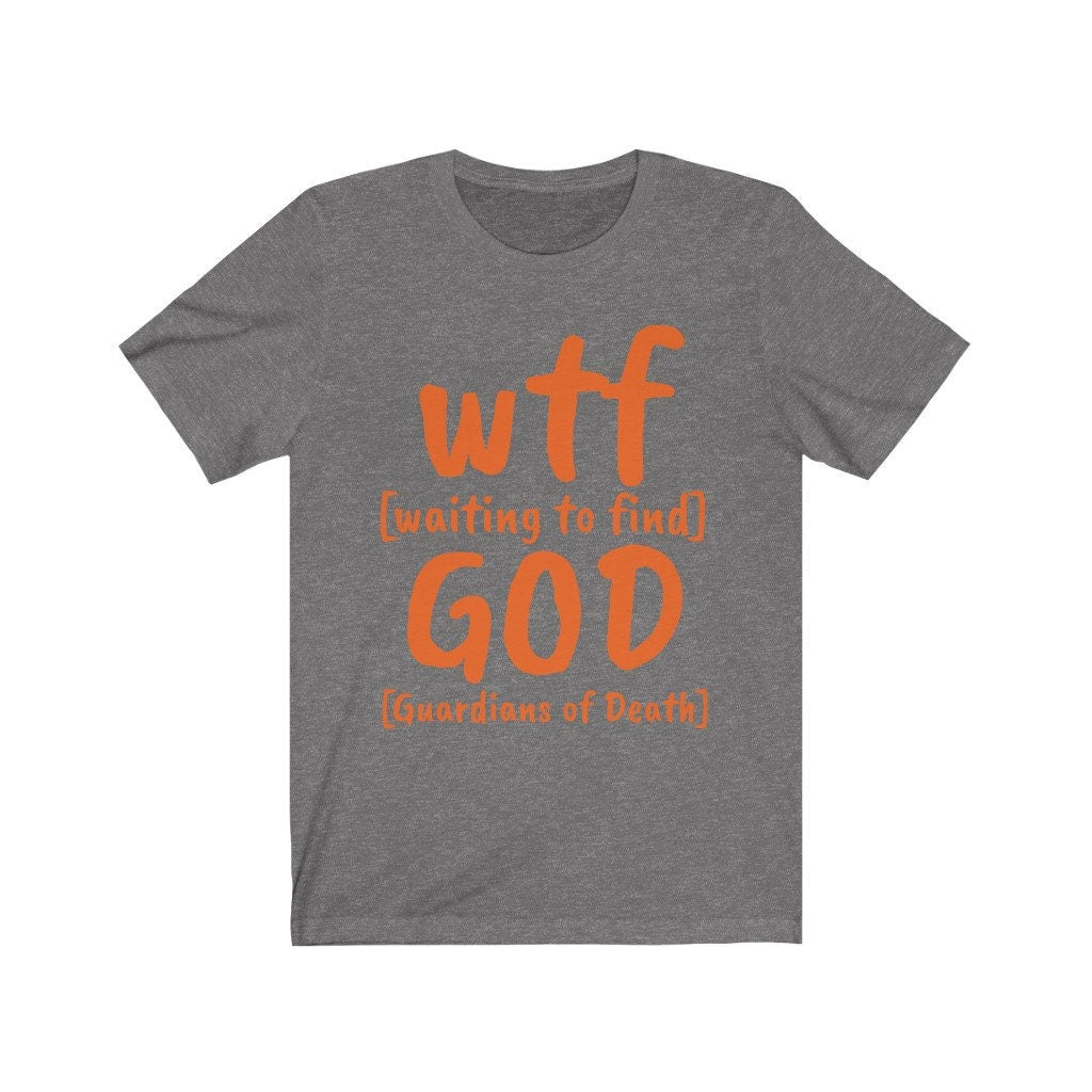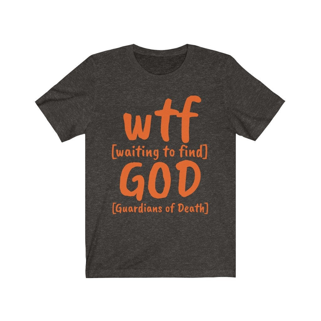 Need a unique gift idea? WTF God, Waiting to find Guardians of Death, Unisex funny t-shirts for MEN and Women make great gifts for any occasion.